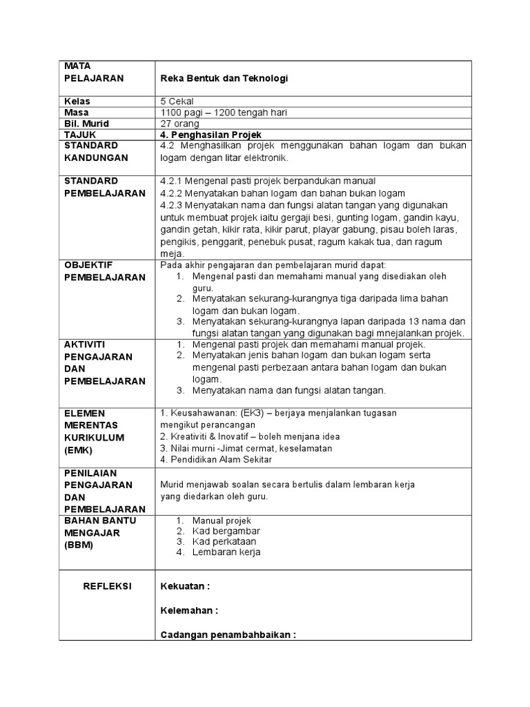 Contoh Rph Reka Bentuk Dan Teknologi Tahun 5 Penghasilan Projek
