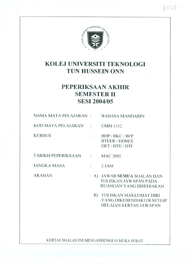 Kertas Peperiksaan Akhir Bahasa Mandarin Uthm