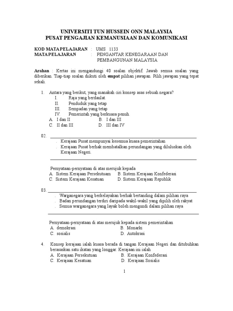 Contoh Contoh Soalan Kenegaraan Malaysia Set Final Exam Versi Kuis Rosfazila Abd Rahman Ph D