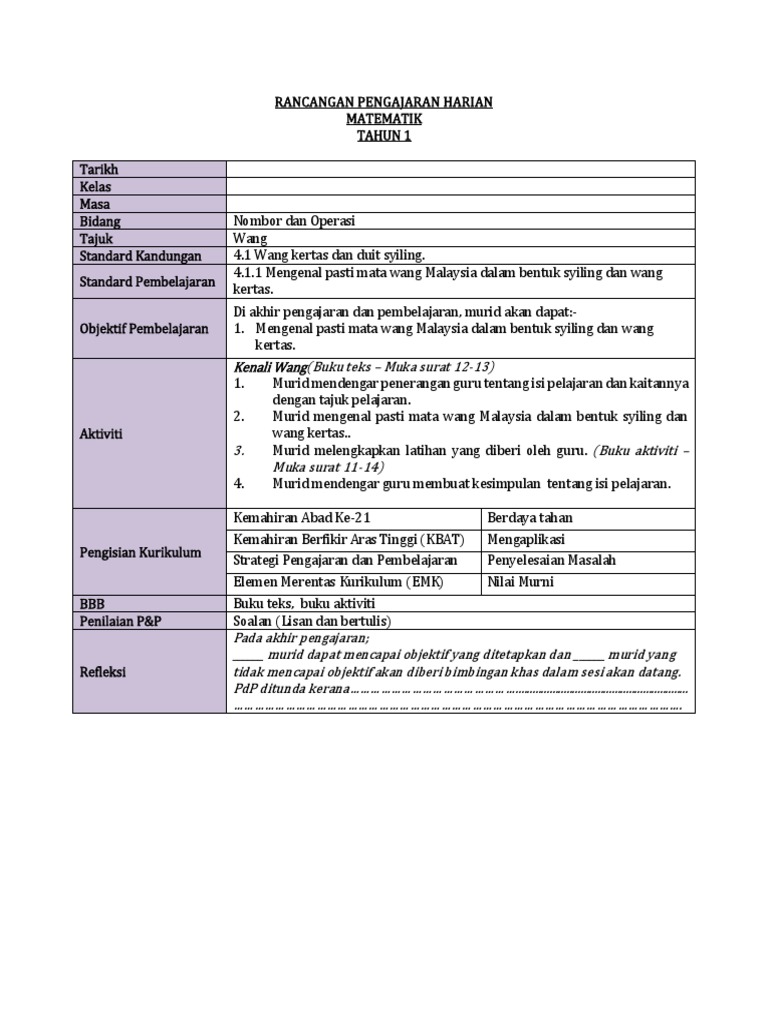 Rancangan Pengajaran Harian Tahun 1 Wang