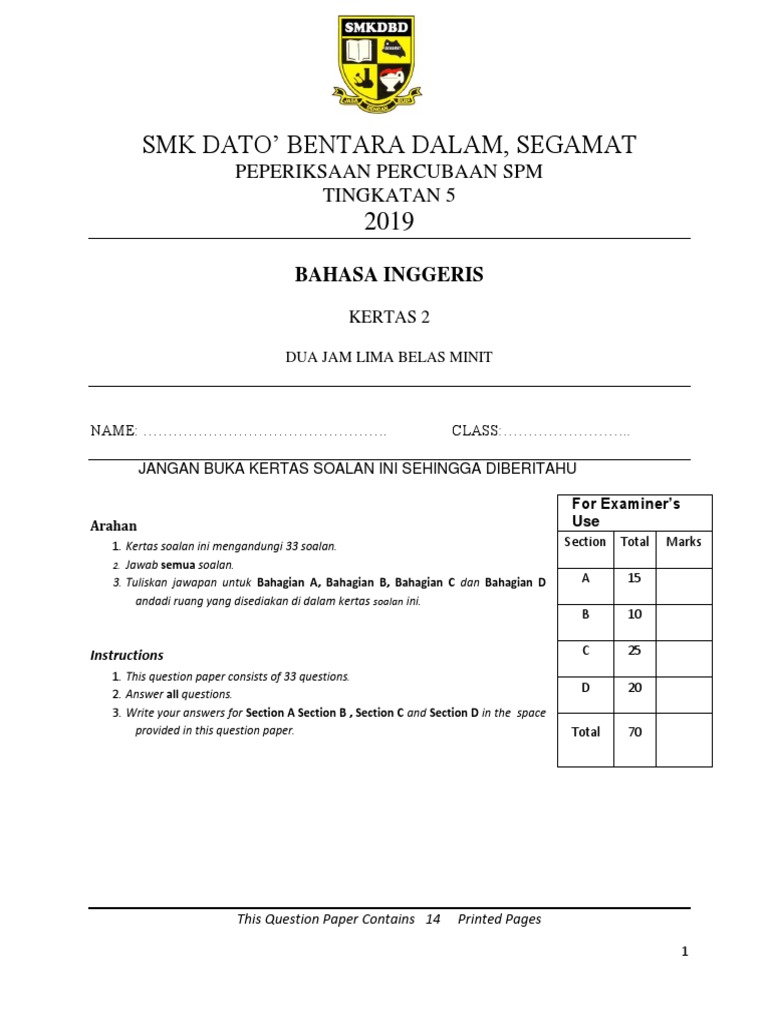 Percubaan Spm 2019 Bahasa Inggeris Sumber Pendidikan