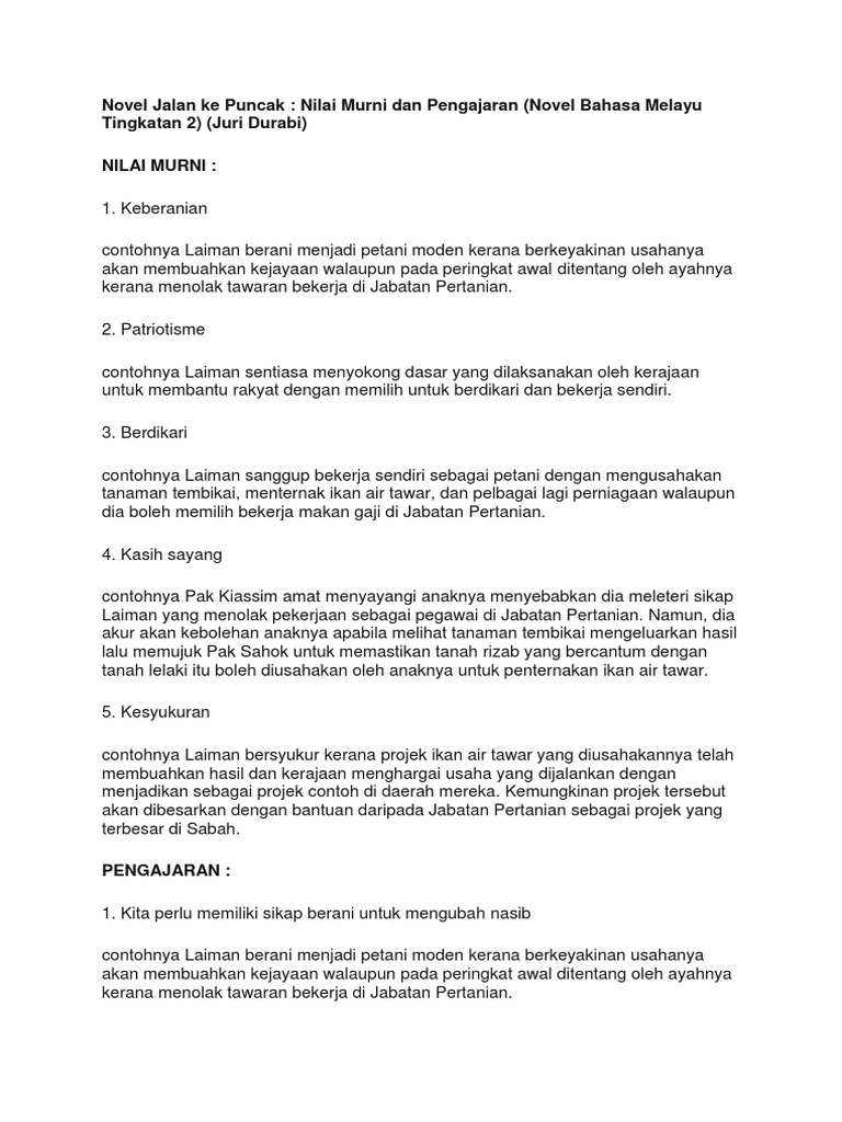 Nilai Pengajran Novel Tingkatan 2 Jalan Ke Puncak