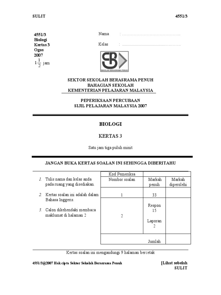 Muka Depan K3 Biologi Percubaan Sbp 2007