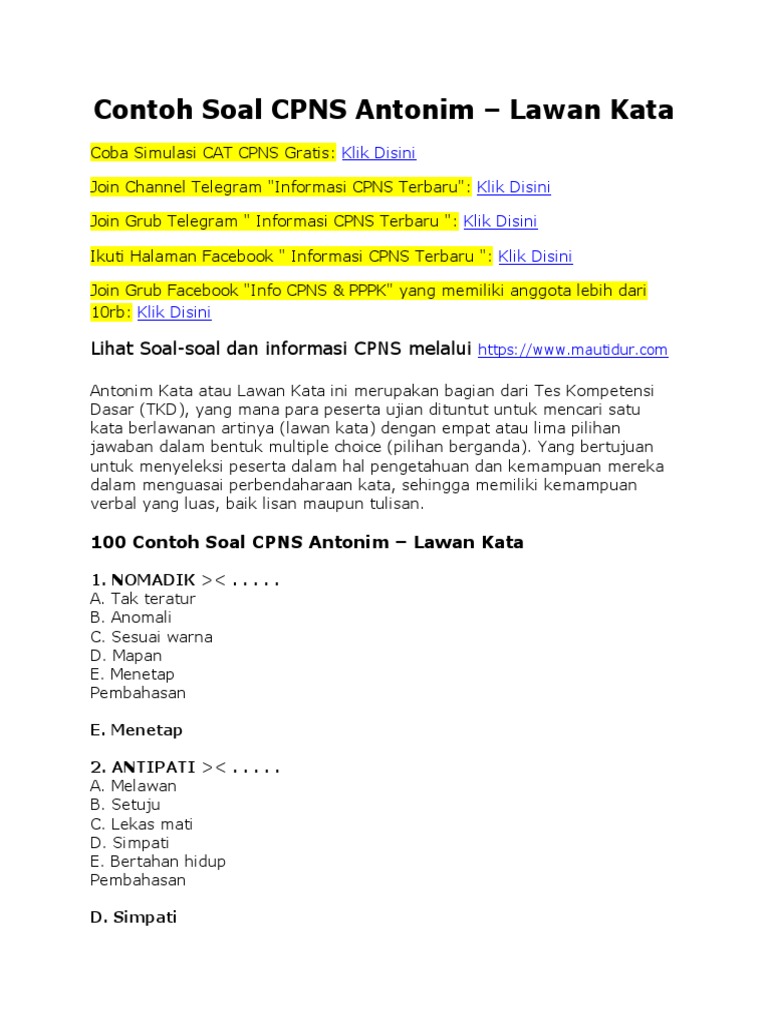 100 Contoh Soal Cpns Antonim Lawan Kata Jawabannya