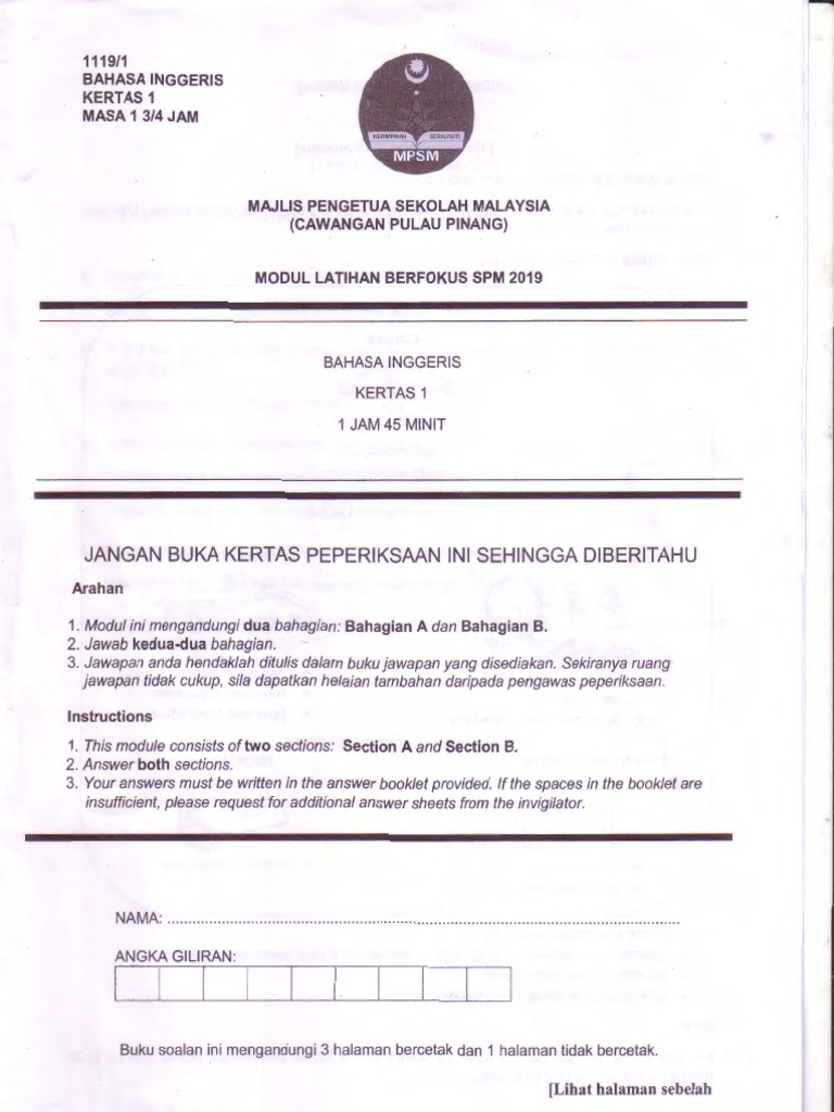 2019 Percubaan Spm Pulau Pinang Bahasa Inggeris Kertas 1 Soalan Dan Skema Pdf Vocabulary Punctuation