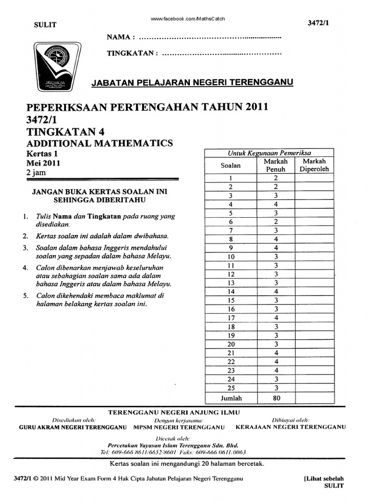2011 Peperiksaan Akhir Tahun Tingkatan 4 Addmaths Skema Terengganu Pdf