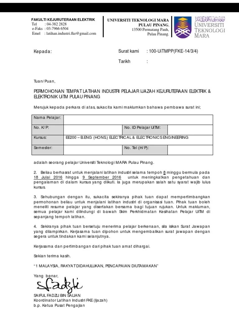 Contoh Surat Permohonan Pertukaran Latihan Industri New Cute766
